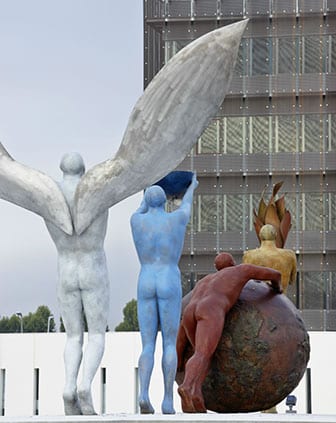 En el paseo de La Lastra, cuatro esculturas nos recuerdan que no todo está perdido. Me resulta imposible pasar delante de ellas sin conmoverme. Por su belleza, pero también porque en mi corazón irán siempre asociadas a quien ideó que estén allí: el hotelero y gran creativo Jaime Quindós. Lástima que este conjunto escultórico, que representa a los cuatros elementos, esté necesitado hoy de unas horas de iluminación nocturna, para que pueda cumplir su misión de creador de atmósferas, que esa y no otra ha de ser la función del arte urbano. Su autora, Esperanza d’Ors, ha inaugurado en Ármaga Mitos humanos, en la línea de sus anteriores indagaciones sobre la mitología clásica. Sus esculturas son sutil proclamación sobre la pervivencia de la belleza y la verdad en nuestro mundo herido. Para el cartel se ha seleccionado una pieza exquisita, Touch the sky (Toca el cielo), inspirada en un poema de Borges. Nos muestras a Ícaro subiendo por una escalera de mano, pese a tener alas. O más exactamente, en tres peldaños de su ascensión. A veces, aunque las tengas es indispensable subirlos, pues forman parte del camino. Estuvo acompañada por su marido, el periodista y dramaturgo Ignacio Amestoy, con quien conversé sobre una de sus producciones teatrales La última sesión de Freud, imaginario encuentro entre Freud y C. S. Lewis, en las inmediaciones de la II Guerra Mundial. Ambos, d’Ors y Amestoy, siguen derrochando sencillez e inteligencia.
