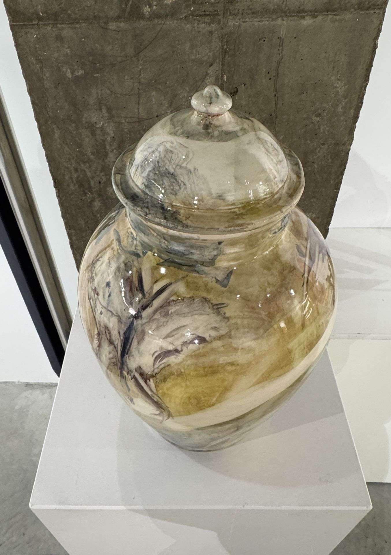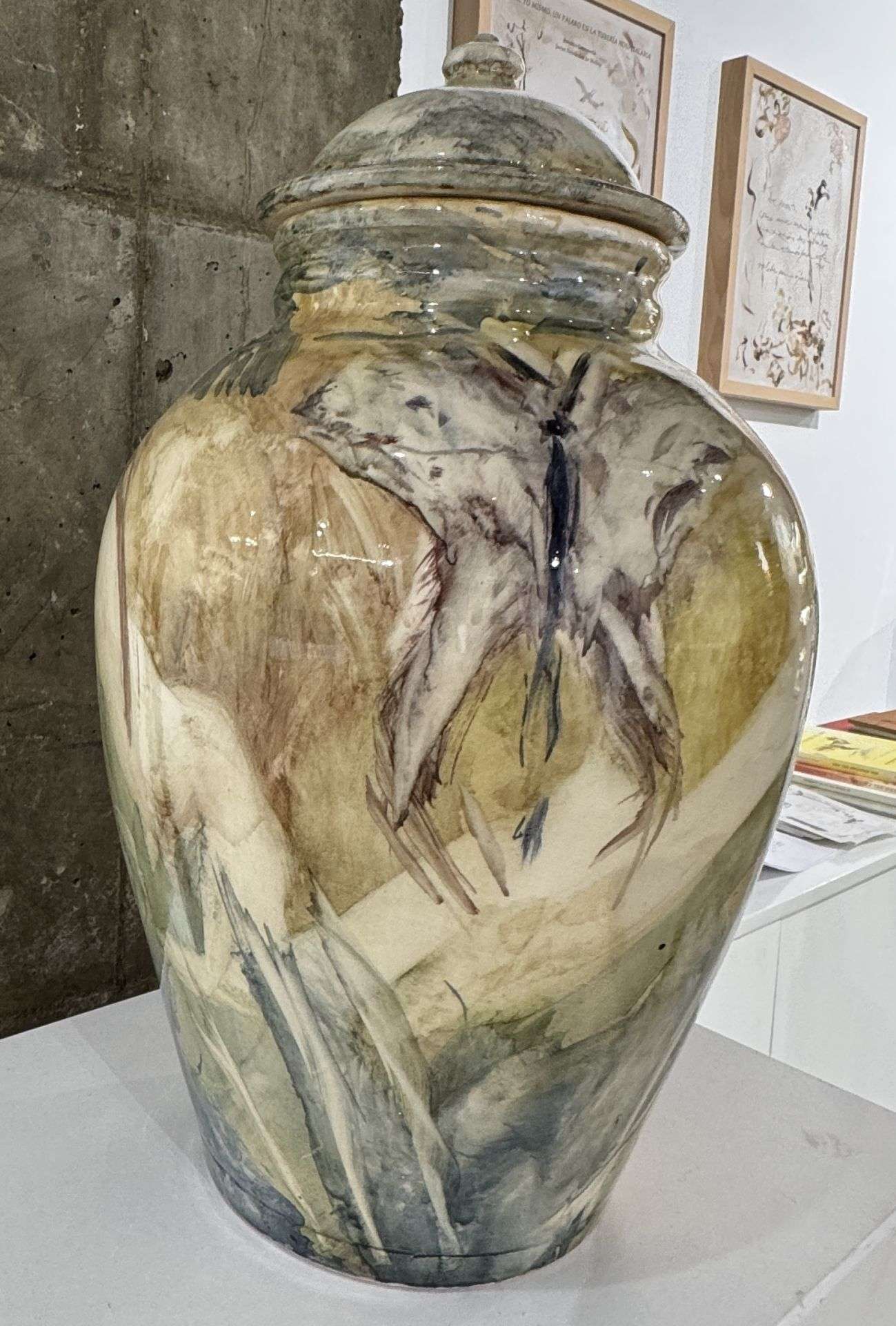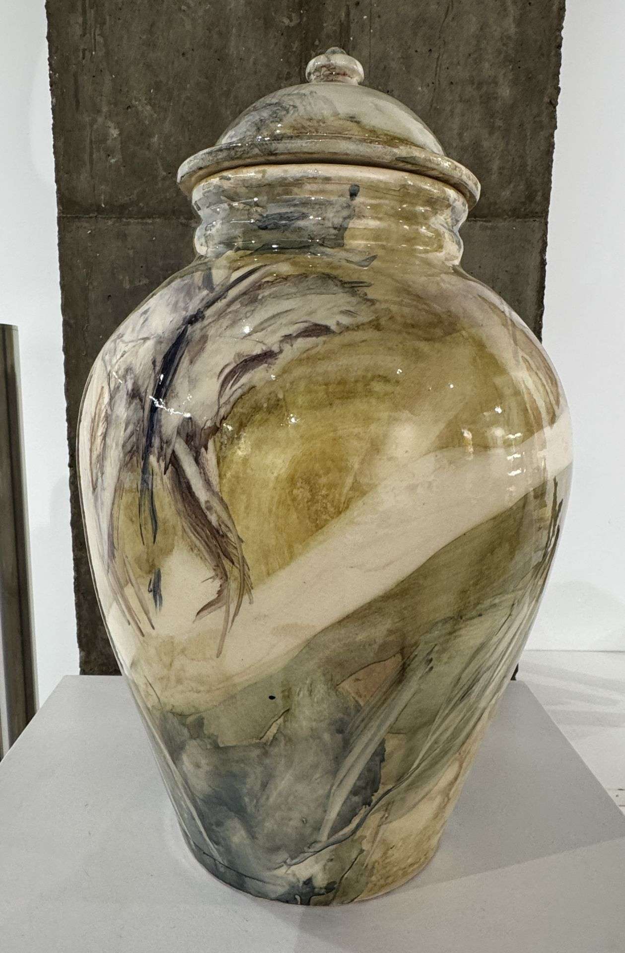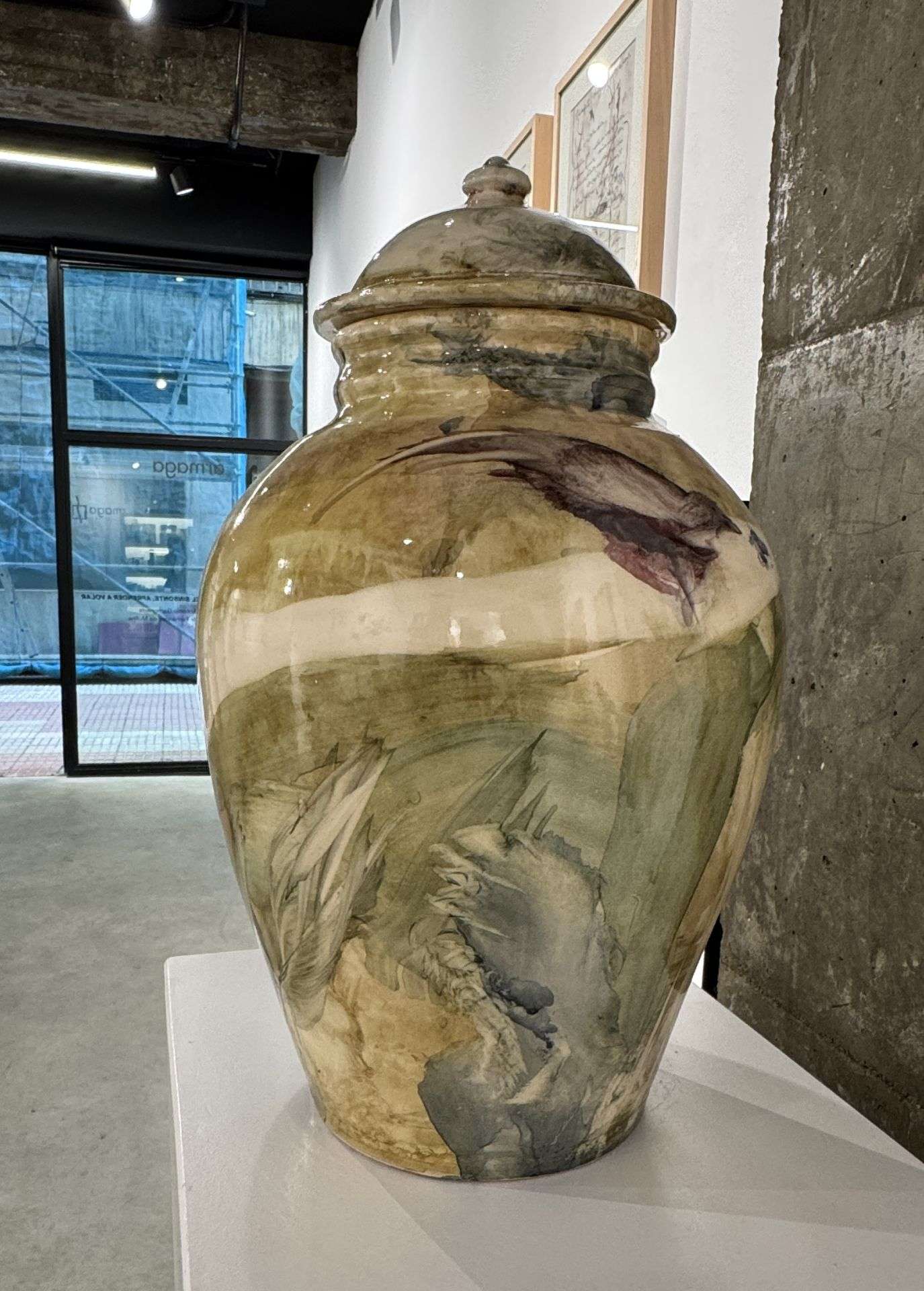 Esta pieza forma parte de la exposición El Hospital y el sinsonte, aprender a volar. Se trata de una cerámica tradicional (loza) esmaltada por Javier Fernández de Molina. El pájaro, el sinsonte, emerge entre las expresivas y extensas pinceladas de color en relación con el poema creado en diálogo con Antonio Gamoneda.