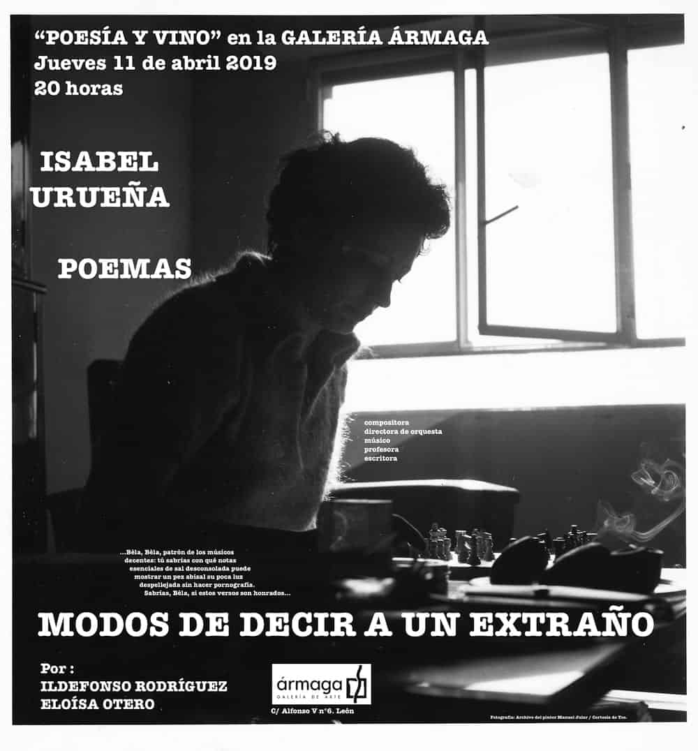 La galería leonesa Ármaga (C/Alfonso V, 6) acoge este jueves 11 de abril de 2019, a las 20 horas, con la escenografía de los dibujos del artista vasco Víctor Arrizabalaga al fondo, la quinta lectura poética del ciclo “Poesía y vino”, que quiere convertirse en un acto para recordar a la compositora y escritora leonesa Isabel Urueña, fallecida el pasado verano. Los poetas Ildefonso Rodríguez y Eloísa Otero se encargarán de recitar algunos poemas de los dos libros que publicó Isabel Urueña en vida, “Apócrifas codicias” y “El beleño en su raíz”.